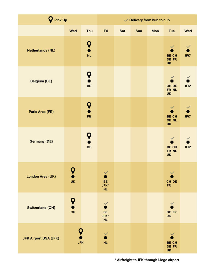 • The Netherlands • Belgium • Paris area • Germany • Switzerland • London area • JFK (USA)